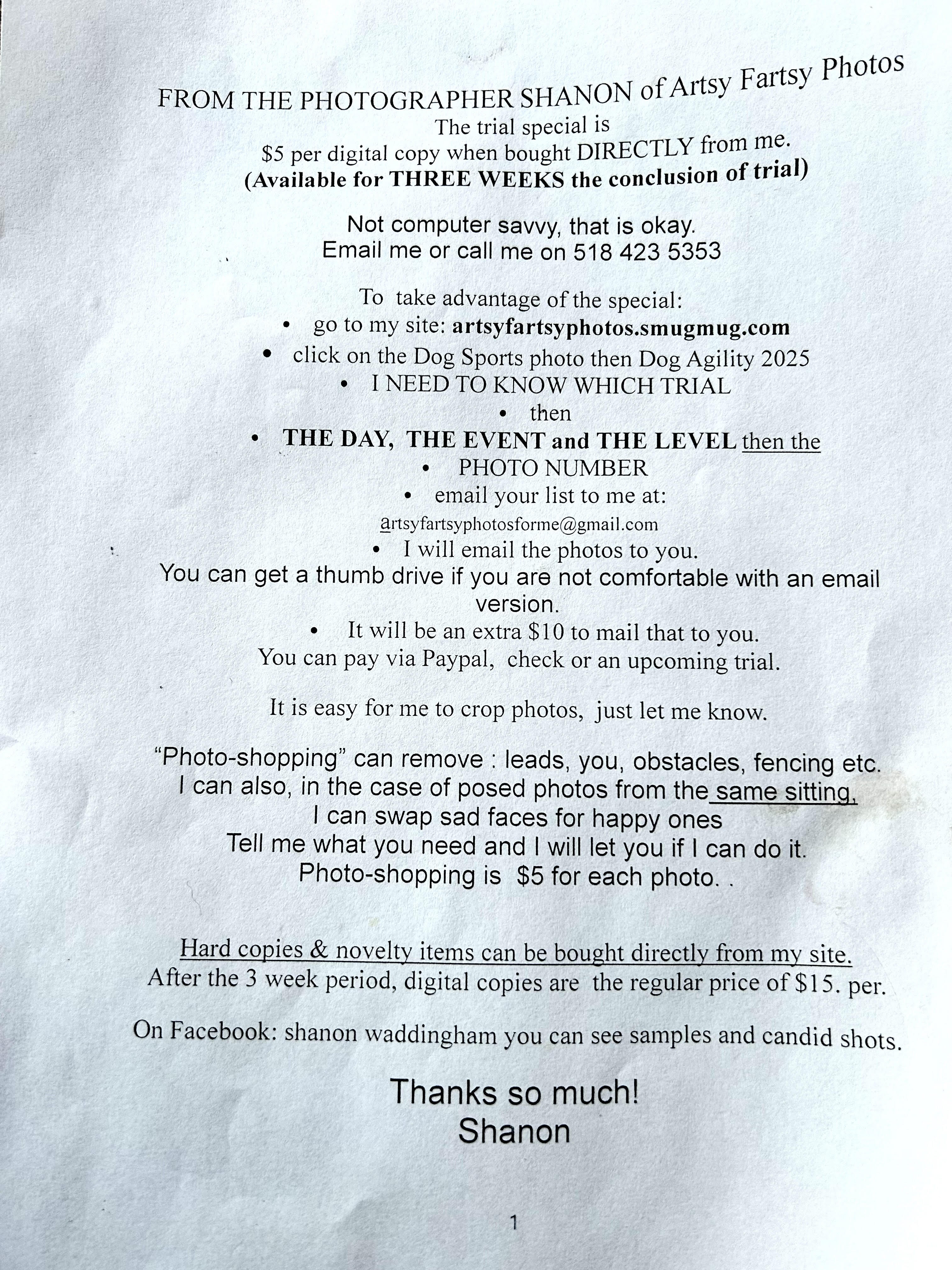 Fees: 1-4 runs $18, 5-9 runs $17, 10+ runs $15 (same dog), Junior Handler Fee $8